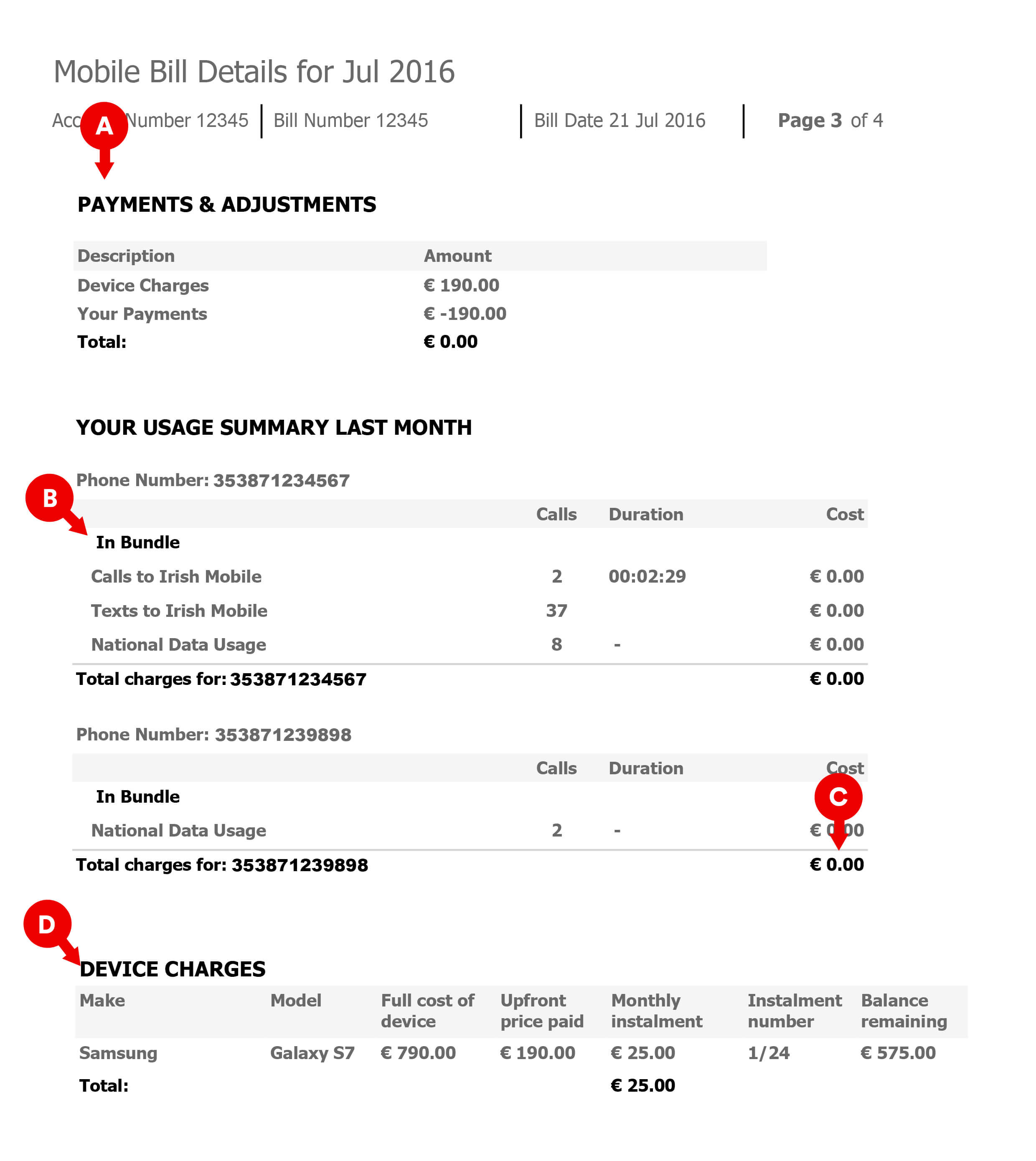 This is the total amount you need to pay. Handily there are lots of ways to pay your bill including Direct Debit, at virginmedia.ie, credit or debit card, at your bank, by cash or by post. Find out more at virginmedia.ie/billing